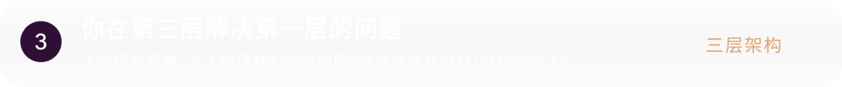 - 层级认知误区: 典型的 认知撕裂 ——领导者试图在「第三层」(人、货、场的表象)去解决「第一层」(底层逻辑与基石)的问题。