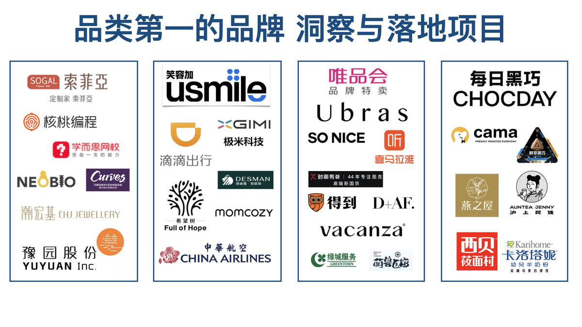 我们以原创的「MOT方法论」,成功协助「喜马拉雅、上海豫园、滴滴代驾、索菲亚整家定制、每日黑巧、德施曼智能锁、Ubras、SO NICE、D+AF、cama、usmile…等数百个行业领导品牌,实现品牌成长。